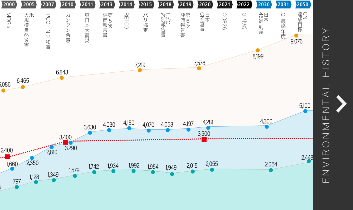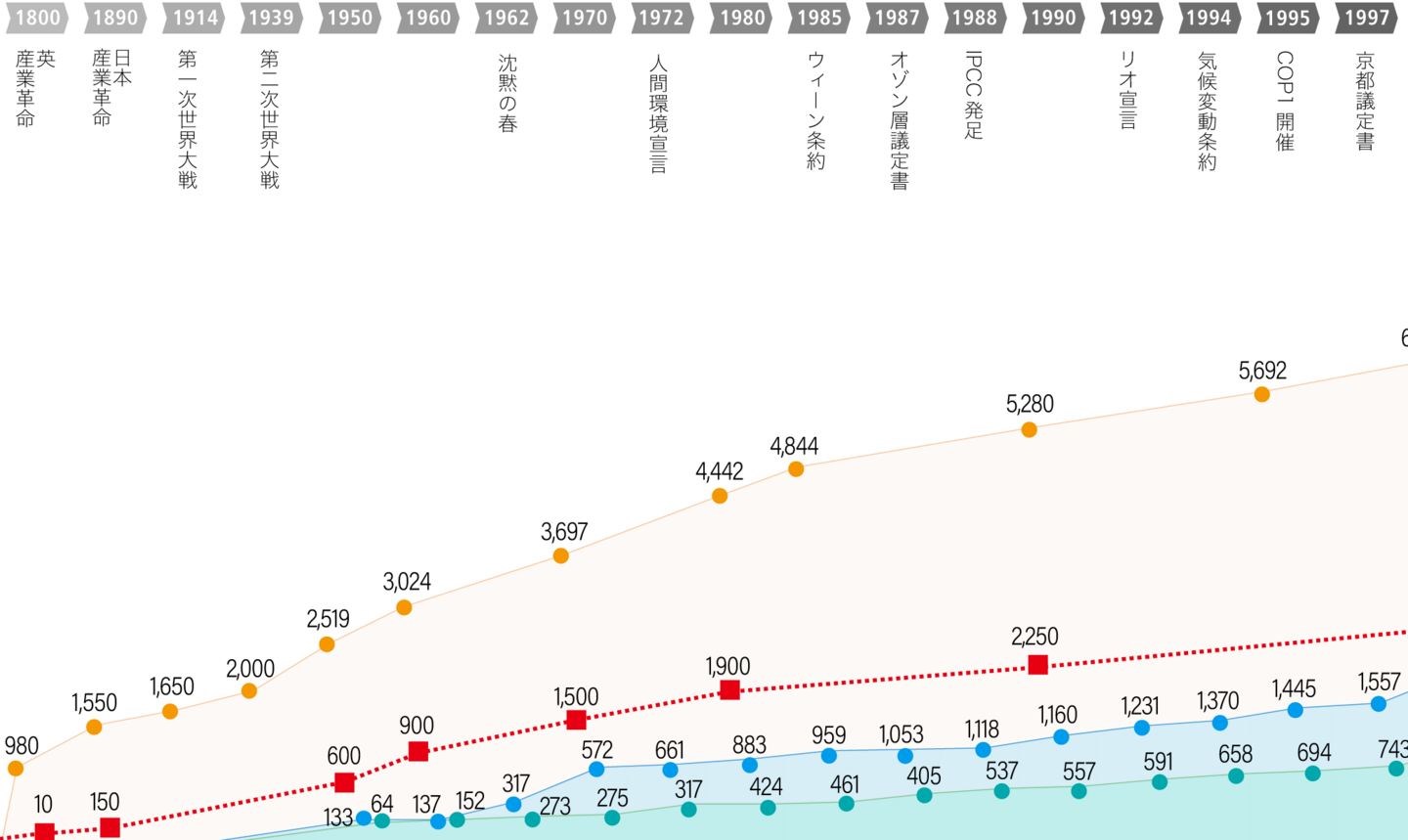 1800年代にイギリスから興った産業革命以降の環境に関するトピックスを、世界のCO2排出量の推移等キーファクターの数字と共に年表にした
